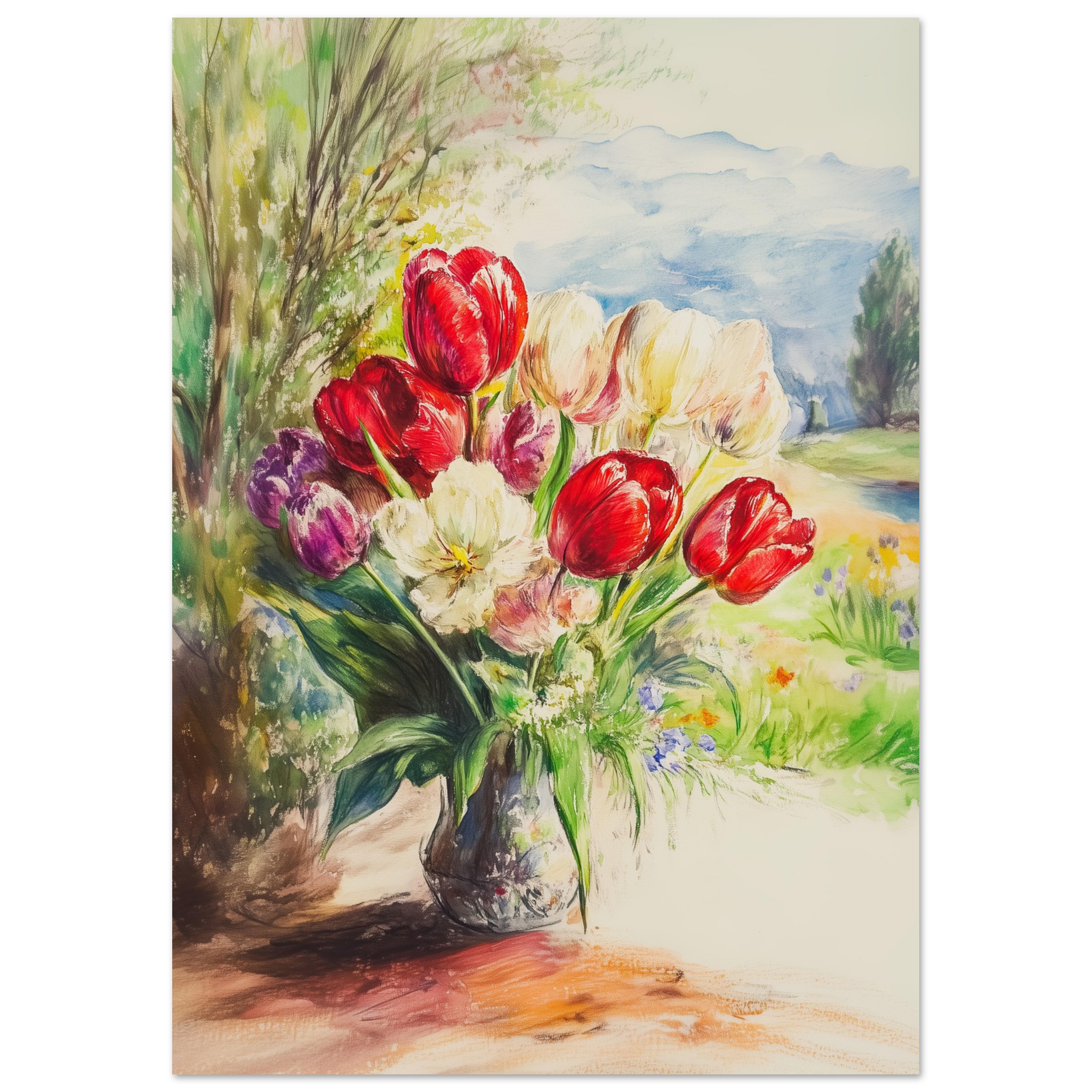 A vibrant and colorful painting of a bouquet of tulips in a vase. The tulips are in various shades of red, white, and purple. The background features a scenic landscape with trees, greenery, and a distant view of mountains under a blue sky.