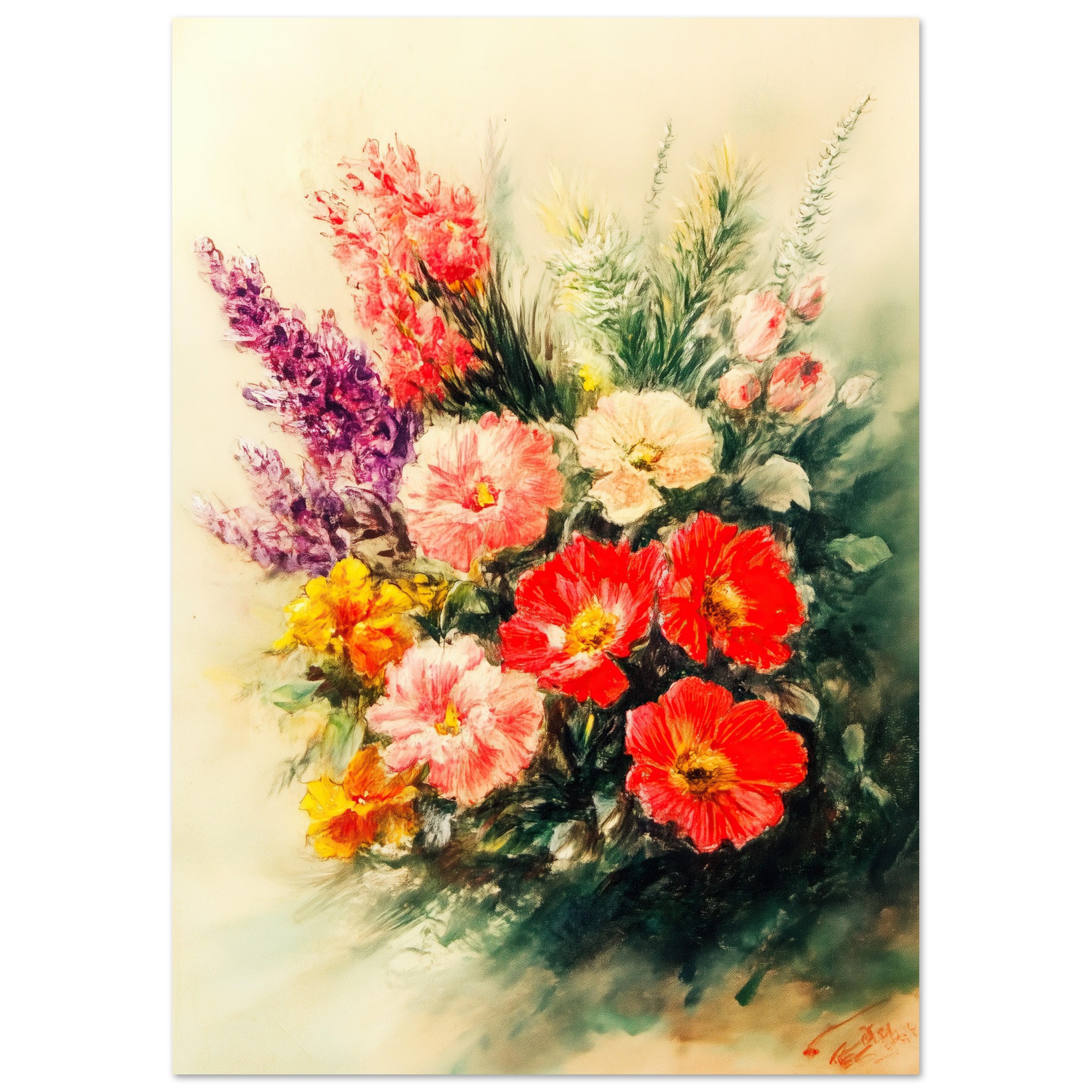 Bouquet of flowers in different colors and shapes. Prominent flowers in the painting are large red and pink blooms, likely poppies, with yellow centers. There are also clusters of smaller yellow flowers, purple flowers, and pink buds. The background is a soft, light gradient that emphasizes the vivid colors of the flowers. The painting has a realistic yet slightly impressionistic style, with visible brushstrokes and a sense of movement in the arrangement of the flowers.